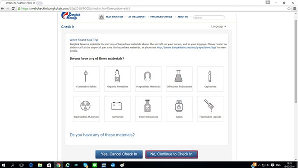 เมื่อกดแล้วจะไปที่หน้าแจ้งการนำสิ่งของต้องห้ามขึ้นเครื่องคะเมื่อเราไม่มีสิ่งเหล่านั้น กดที่ No, Continue to Check in ได้เลยคะ
